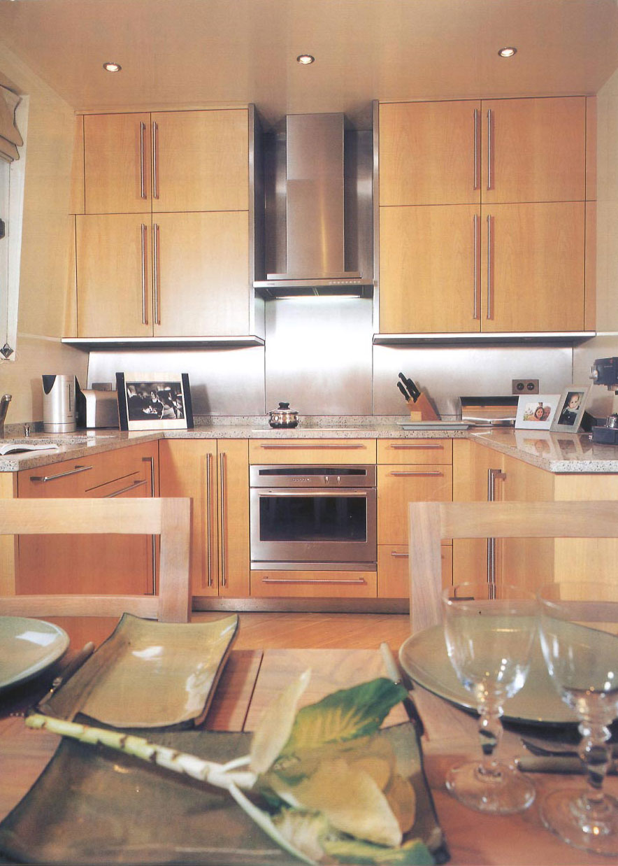 Un appartement de 95 m² habitables a été obtenu en réunissant les chambres de service du dernier étage de cet immeuble parisien de la « Belle Epoque ». Une volée d’escaliers a été ajoutée au palier du 5ème étage pour atteindre le 6ème étage et utiliser l’ascenseur. Les huisseries des fenêtres ont été entièrement repensées pour encadrer le paysage comme si celui-ci était un tableau. Au lieu de créer un espace cuisine et une salle à manger, les deux fonctions ont été réunies en un espace unique, accessible depuis le séjour par une double porte coulissante.